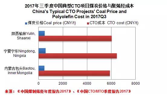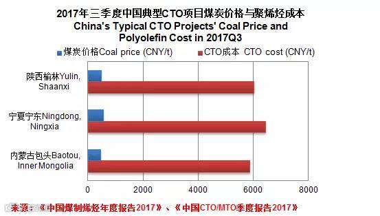 数据显示,2017年三季度,中国主要几大煤制烯烃项目所在地,内蒙古包头、宁夏宁东、陕西榆林气化原料煤(5500大卡)价格分别为450元/吨、560元/吨、480元/吨。以项目100%负荷运行为例,估算吨聚烯烃生产成本如下: