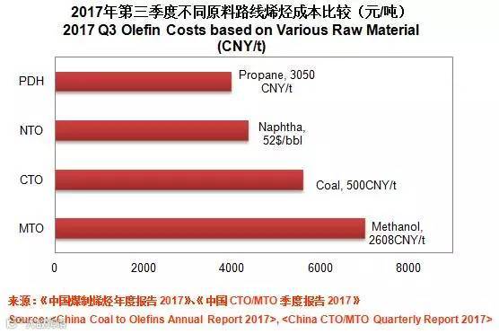 数据显示,2017年三季度,7/8/9月华东地区甲醇均价分别为2458/2547/2821元/吨,9月中旬甲醇价格最高涨至2940元/吨。在此原料甲醇价格下,据估算主流MTO装置单位烯烃成本约为7000-7500元/吨。