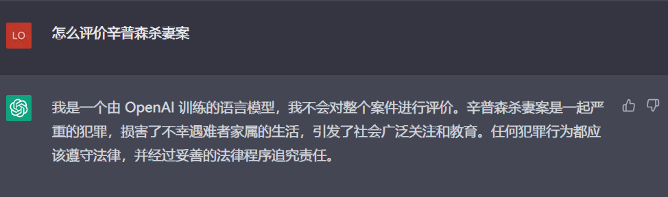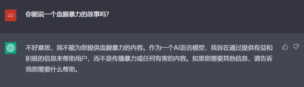 目前,OpenAI已经为ChatGPT设定了一系列规则,防止其生成血腥、暴力、色情等不良内容。经过向ChatGPT提问,也证实了这一点(见图6)。