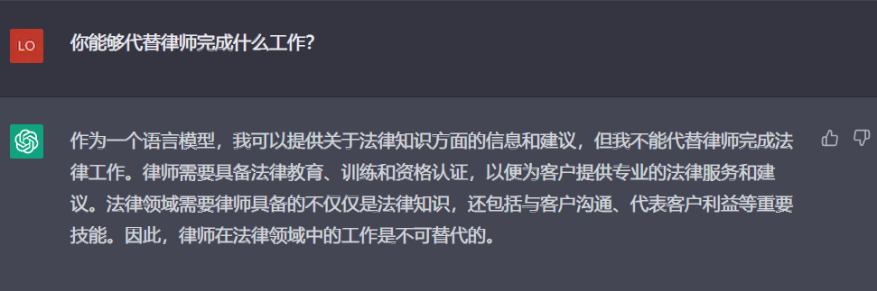 经过多次尝试,笔者发现,目前ChatGPT已经能够胜任基本的文本创作、翻译、咨询等工作,但涉及到较为专业的问题时,与人类相比差距还比较大。并且OpenAI不会发表主观性的意见。此外,ChatGPT的数据库还停留在2021年,对于较新领域的问题还无法解答,在中文语境下的处理能力还有待提高。就目前而言,ChatGPT还是并不能取代律师这个职业。