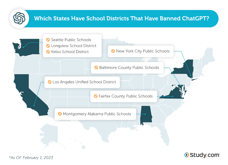 图3:截至2023年2月1日禁用ChatGPT的美国学校,来源Study.com