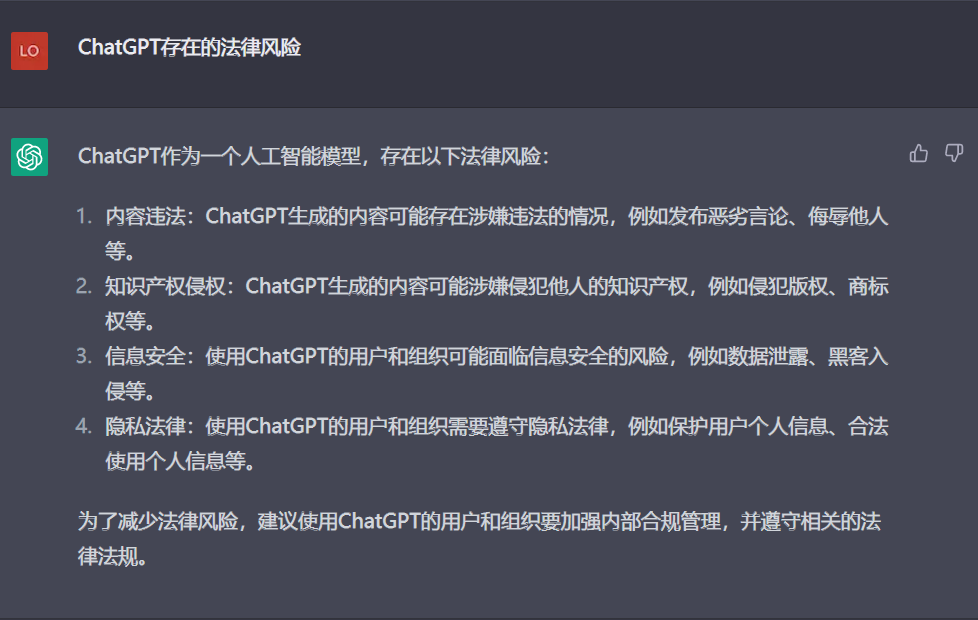 图5:向ChatGPT提问ChatGPT存在的法律风险