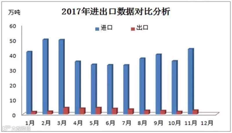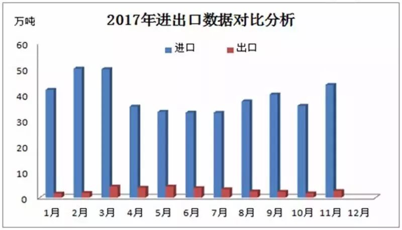 2017年进口量呈现“V”字走势,而进口正好呈现倒“V”走势,说明进口与出口正好呈现相互吻合的状态。但出口近几年依旧呈现弱势偏弱局势,主要原因国内出口产品多为通用产品,而出口国家多为东南亚等附近国家,对于缓解国内供需目前仍需扩大出口力度。