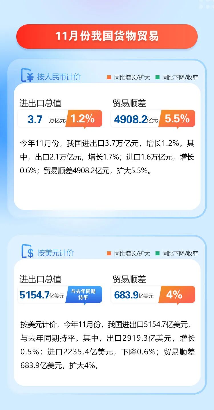 图解 | 前11个月进出口持平 11月份同比增长1.2%