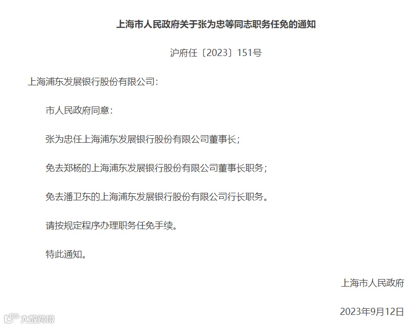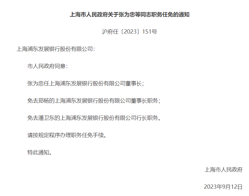 近日,上海市政府发布的一组人事任免信息显示,张为忠任浦发银行董事长,同时,免去郑杨的浦发银行董事长、潘卫东的浦发银行行长职务,并按规定程序办理职务任免手续。