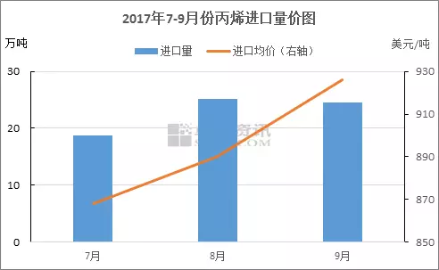 上图可以看出,8月份与9月份的进口量较7月份相比有明显增加,9月份的进口量24.56万吨,虽然较8月份相比有所减少,但是仍然比较可观。而进口均价也成直线上升的形式。9月底,山东丙烯市场主流价格在8350-8420元/吨,较7月底增长1060元/吨,涨幅14.5%。8、9月份国内丙烯市场价格上涨主要是受下游需求的利好,下游需求旺盛,对丙烯采购积极性高,而进口丙烯也基本被消化,因此,8、9月份丙烯进口量的增加以及进口均价的上升,与国内丙烯市场行情好转有很大的关系。