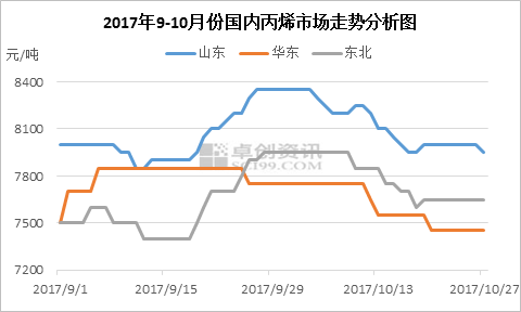 金色九月之后,丙烯市场价格下滑,国内丙烯的主要市场都呈现出下跌走势,山东价格最高,维持在8000元/吨附近,东北以及华东地区价格较低,尤其华东地区,截至10月27日,华东地区价格跌至7450元/吨。