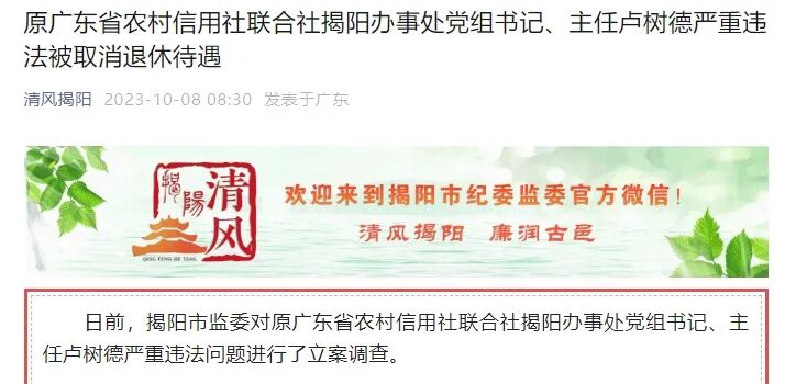 据“清风揭阳”微信公众号消息:日前,揭阳市监委对原广东省农村信用社联合社揭阳办事处党组书记、主任卢树德严重违法问题进行了立案调查。