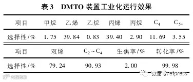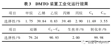 2010年6月,DMTO-Ⅱ技术通过专家组技术鉴定。同年10月,大连化物所将该技术授权陕西蒲城清洁能源化工有限公司。2014年12月,DMTO-Ⅱ工业示范装置开车成功,12月24日生产出聚合级丙烯,12月25日生产出聚合级乙烯。这标志着我国具有自主知识产权的新一代甲醇制烯烃技术工业推广应用取得重大阶段性成果。甘肃华泓汇金亦将在其70万t/a烯烃项目中采用DMTO-Ⅱ技术。DMTO工艺工业化运行效果如表3所示,其产品气中乙烯质量选择性为39.84%,丙烯质量选择性为39.40%,C2~C4质量选择性为90.93%,甲醇转化率99.98%,生焦率2.00%。