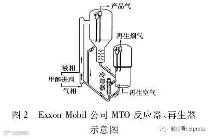 美国埃克森美孚(Exxon-Mobil)公司在MTO工艺及催化剂领域进行了大量研究,并在SAPO-34分子筛及MTO工艺领域拥有大量专利。据其公开的专利含氧化合物制低碳烯烃(OxygenatetoOlefins,OTO)显示,反、再两器结构示意图如图2所示。