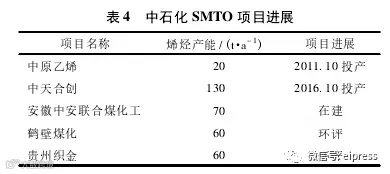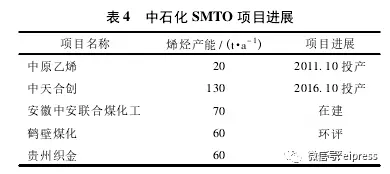 10月28日,中天合创煤炭深加工示范项目打通全流程,产出合格聚乙烯、聚丙烯,标志着国内最大规模的煤制烯烃项目投产。此外,采用SMTO工艺的还有安徽中安联合煤化工、河南鹤壁煤化一体化项目、贵州织金等,如表4所示。