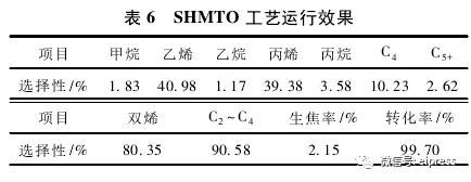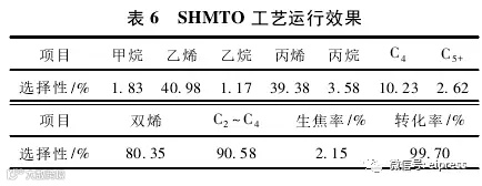 神华新疆化工有限公司是神华集团全资子公司———中国神华煤制油化工有限公司直属分公司,2012年6月6日,在新疆甘泉堡工业区正式挂牌。神华新疆项目采用神华具有自主知识产权的SHMTO工艺,项目规模为180万t甲醇/a制68万t/a烯烃产品。项目采用MTO级甲醇进料,于2016年9月23日投料试车成功,SHMTO工艺工业化运行效果见表6,其乙烯选择性为40.98%,丙烯选择性为39.38%,C2~C4选择性90.58%,甲醇转化率99.70%,生焦率2.15%。