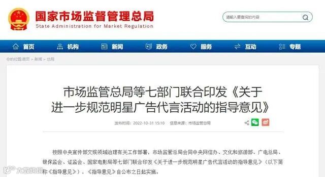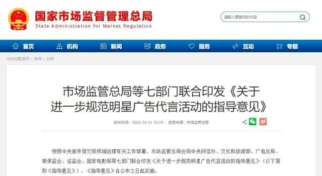 2022年10月31日,市场监管总局会同中央网信办、文化和旅游部、广电总局、原银保监会、证监会、国家电影局等七部门联合印发《关于进一步规范明星广告代言活动的指导意见》。
