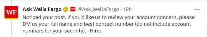 事情持续发酵超过24小时之后,富国银行才在其推特账户上表示,他们遇到一个技术问题,正在处理中,并呼吁受影响的客户私信他们。