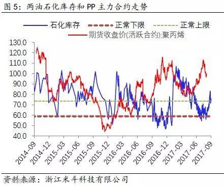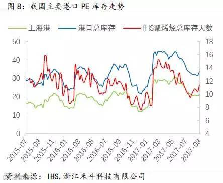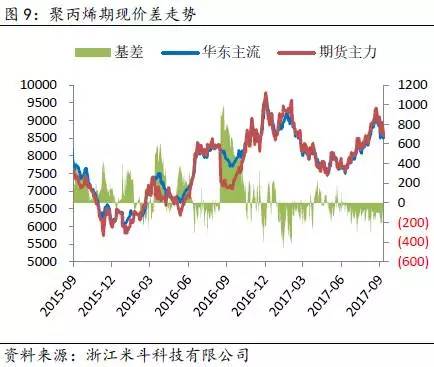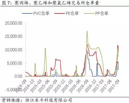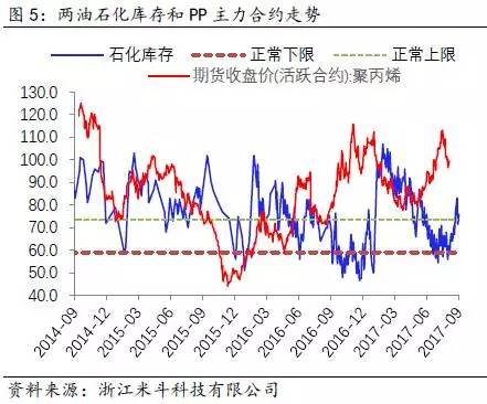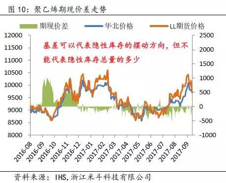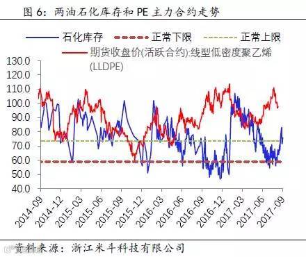 举个例子,2017年8月底至9月中旬约莫半个月的时间周期内,两油库存从60万吨附近逐渐攀升至80万吨,而PP和PE价格出现高位回落、期货升水幅度收窄的现象(PP主力期货合约从9月初前高9813元/吨跌落至今约1000元/吨,期货升水华东拉丝T30S幅度从200元/吨收窄至50-100元/吨;PE主力期货合约从9月初前高10605元/吨跌落至今约1000元/吨,期货升水华北煤化工7042从原先的200元/吨也回落至100-150元/吨)。