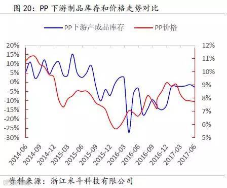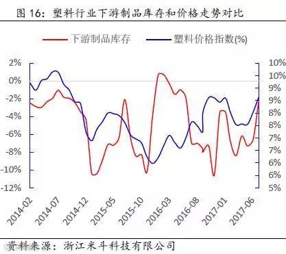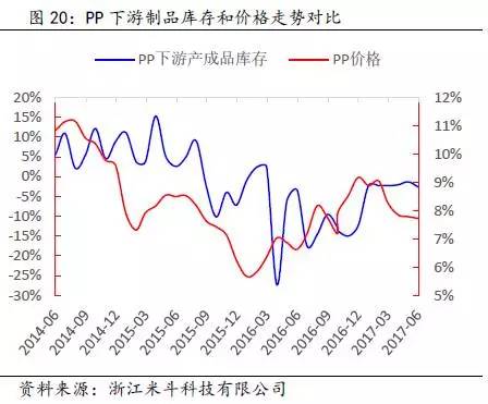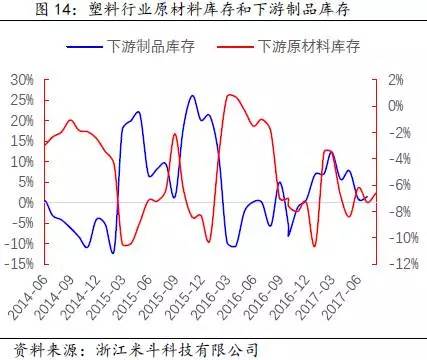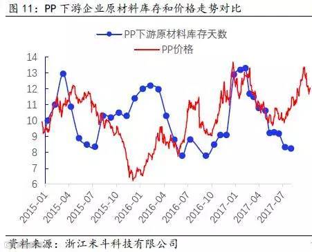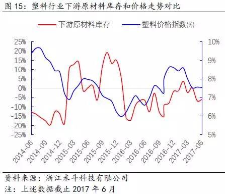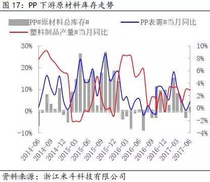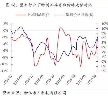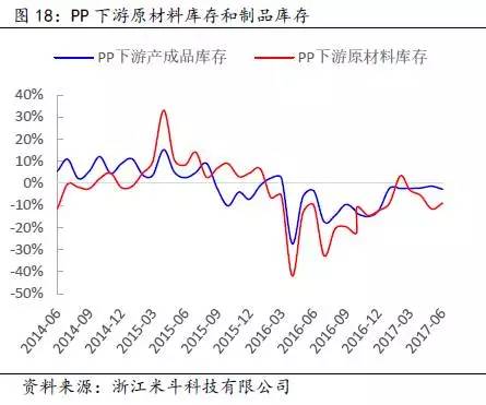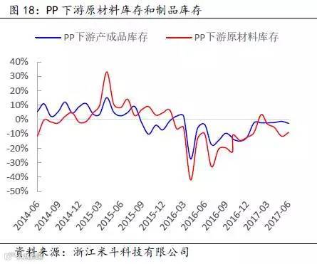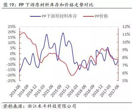其次,通过得出的PP全社会原材料库存数据,再减去PP价格波动的趋势(模拟中游库存趋势变动),可以近似得出PP下游原材料的库存趋势变动。