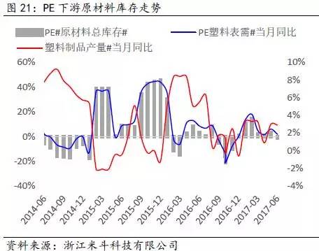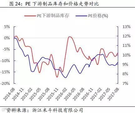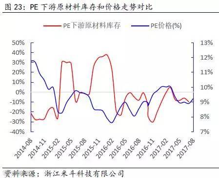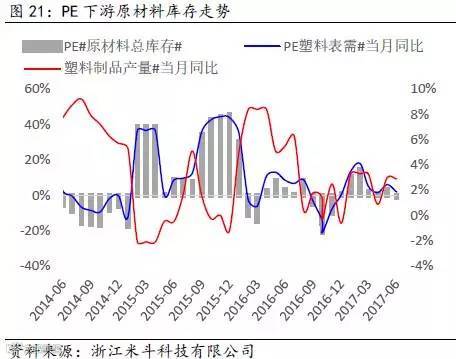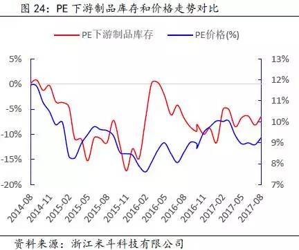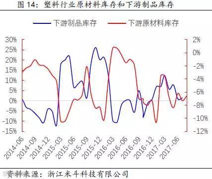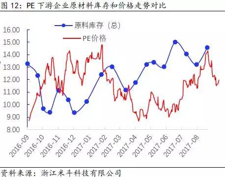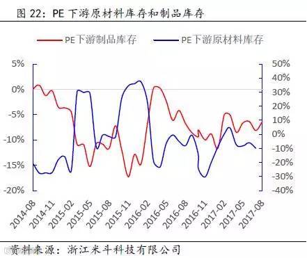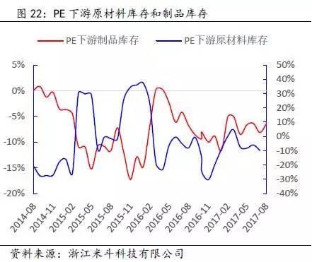 其次,通过得出的PE全社会原材料库存数据,再减去PE价格波动的趋势(模拟中游库存趋势变动),可以近似得出PE下游原材料的库存趋势变动。