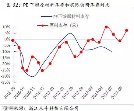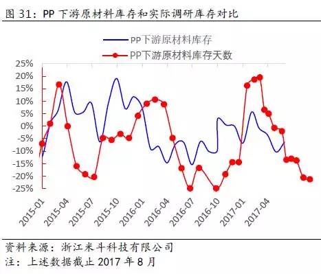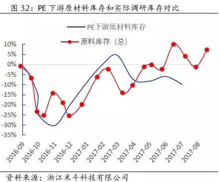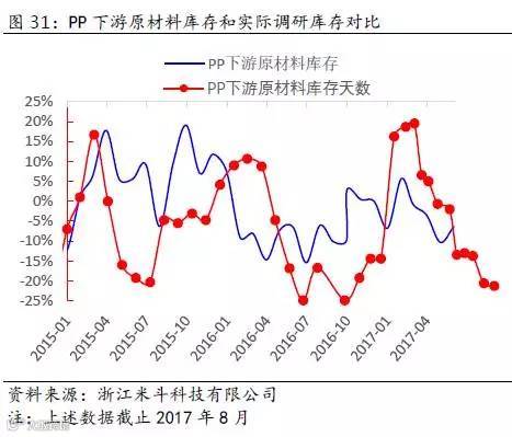 上面图29和图30中,蓝色线条是笔者通过上文提及的近似法做出的PP、PE下游原材料库存趋势变化,红色线条是通过实际调研统计的结果。从直观的图形上来看,两者趋势变化具有一定的正相关性,这也印证了笔者上文提及的近似估计库存的方法具有一定的描述性作用。