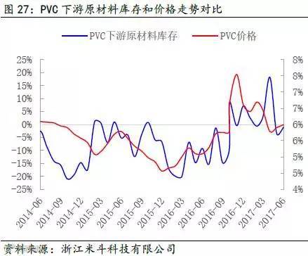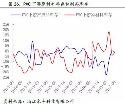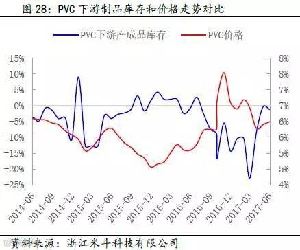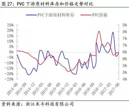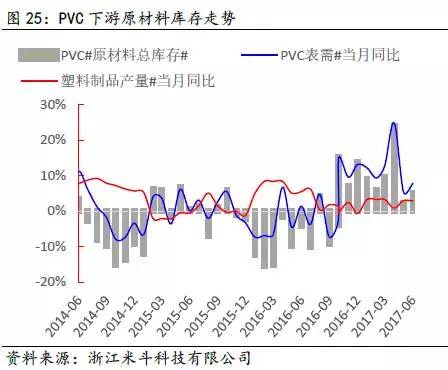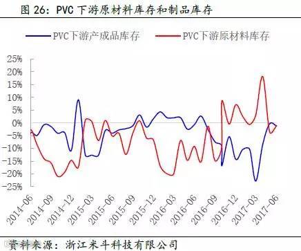 其次,通过得出的PVC全社会原材料库存数据,再减去PVC价格波动的趋势(模拟中游库存趋势变动),可以近似得出PVC下游原材料的库存趋势变动。