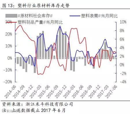 必须承认的是,中下游库存水平的绝对值无法做到精确量化,但是可以通过塑料行业原材料表观供应量增速与塑料制品产量增速的差值,来近似模拟全社会原材料的库存水平,即上游、中游和下游原材料总和。