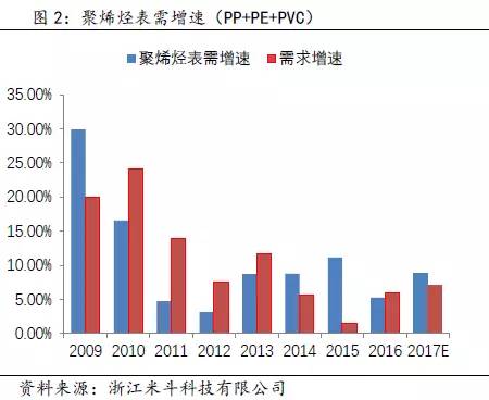 具体来讲,近似的通过水泥产出增速来模拟均聚消费增速,占比39%;通过汽车、彩电、冰箱、洗衣机以及空调的产出增速来模拟注塑消费增速,占比24%;通过乳制品、粮食等产出增速来模拟薄膜和纤维增速,占比29%。具体下游消费的拟合以及该方式准确度的验证可以关注笔者前期的文章:《万丈高楼平地起,聚烯烃价格的根基是什么?》。