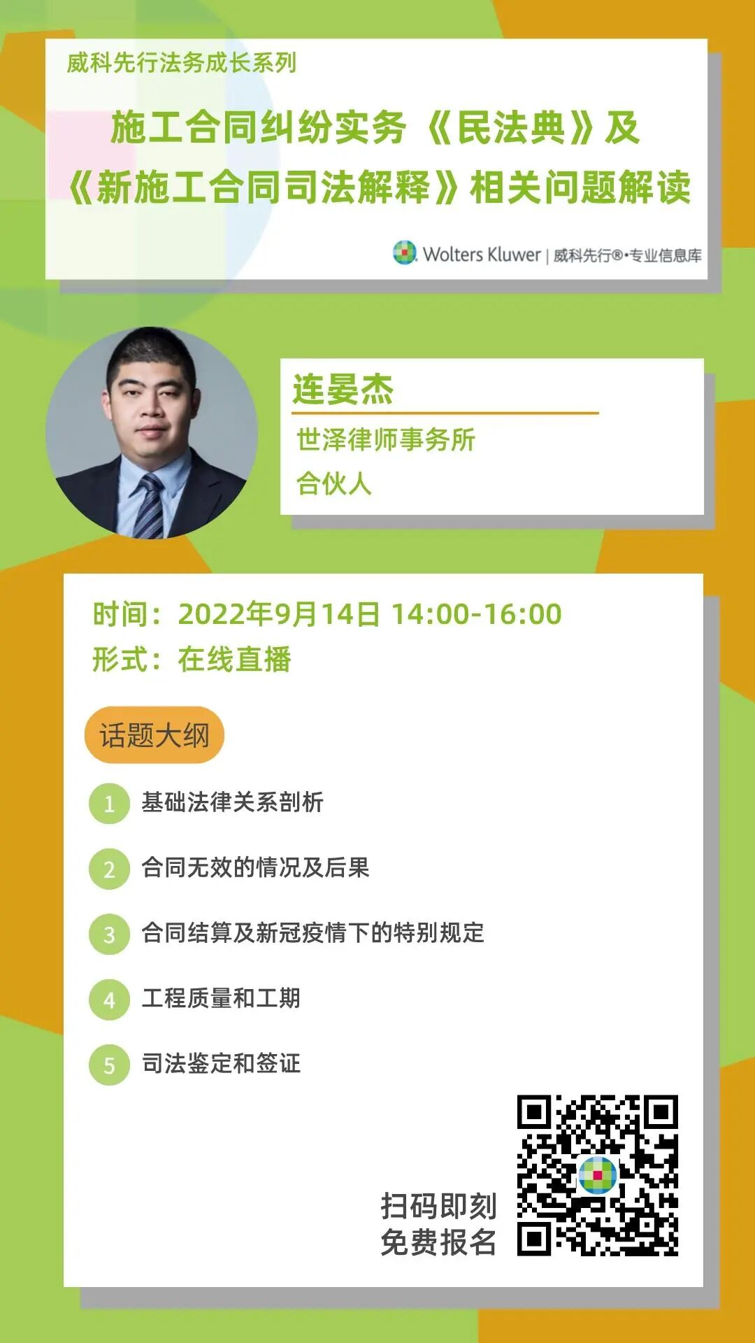 为了更好地为客户解读并促进建设工程领域法律风险的防范,威科先行特邀世泽律师事务所合伙人连晏杰律师为大家带来了施工合同纠纷实务之《民法典》及《新施工合同司法解释》的相关问题解读。