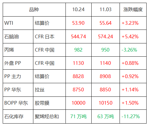 丙烯及粉料方面,丙烯价格,受烟台万华计划11月份重启其PDH装置消息的影响继续回落,江浙报价在7200元/吨左右,目前价格已属低位,下跌空间不大。随着期货和粒料的价格的上升,粉料价格也随之上涨,江浙地区报价8550-8650元/吨,销量亦有所改善。