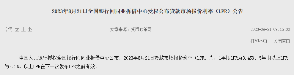 8月21日,新一期贷款市场报价利率(LPR)公布。其中,1年期贷款市场报价利率(LPR)报3.45%,上月为3.55%;5年期以上LPR报4.2%,上月为4.2%。