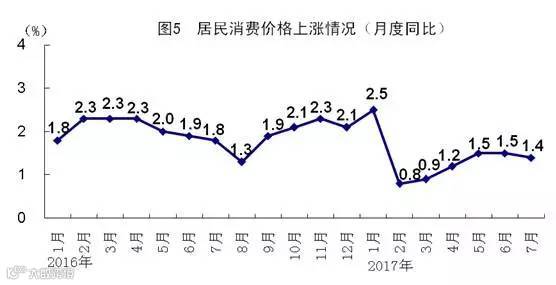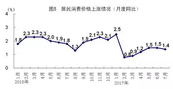 7月份,全国居民消费价格同比上涨1.4%,涨幅比上月回落0.1个百分点。衣着上涨1.4%,居住上涨2.5%,教育文化和娱乐上涨2.5%,医疗保健上涨5.5%。在食品烟酒价格中,猪肉价格下降15.5%,鲜菜价格上涨9.1%。