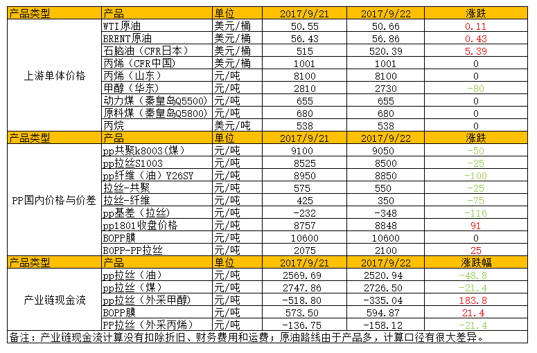 华东主流拉丝8500元/吨,跌幅50元/吨,石化库存近期也明显增加,涨至阶段性高位,基本面缺乏利好,不过近期跌势略有放缓,其继续下跌动能或逐渐减弱。虽然目前PP尚缺乏反弹动力,但是跌势或将逐渐放缓。