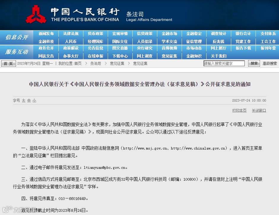7月24日,为落实《中华人民共和国数据安全法》有关要求,加强中国人民银行业务领域数据安全管理,中国人民银行起草了《中国人民银行业务领域数据安全管理办法(征求意见稿)》(以下简称《办法》),现面向社会公开征求意见。