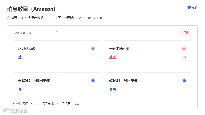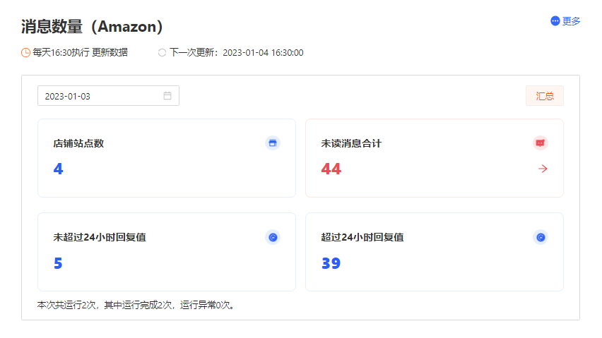 一键打开虎步RPA,自动统计所选店铺、站点的买家消息数量,还能统计消息的逾期时间,形成看板,再也无需手动一个个店铺点击查看消息状态。方便卖家合理规划回复买家消息的所需时间。