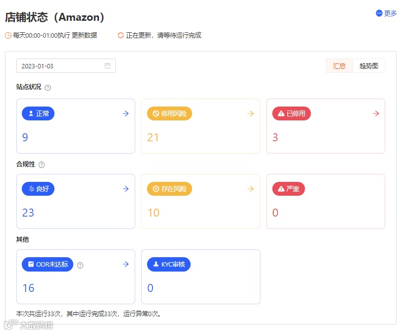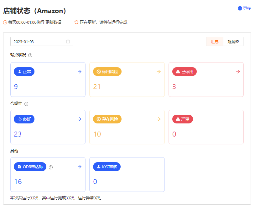 虎步RPA可一表汇总站点状况、订单缺陷数、负面反馈、信用卡拒付、发票缺陷率等影响店铺绩效问题,免去逐个店铺手动打开检查,风险店铺预警更直观,打开虎步查看店铺绩效无风险即可安心享受假期。