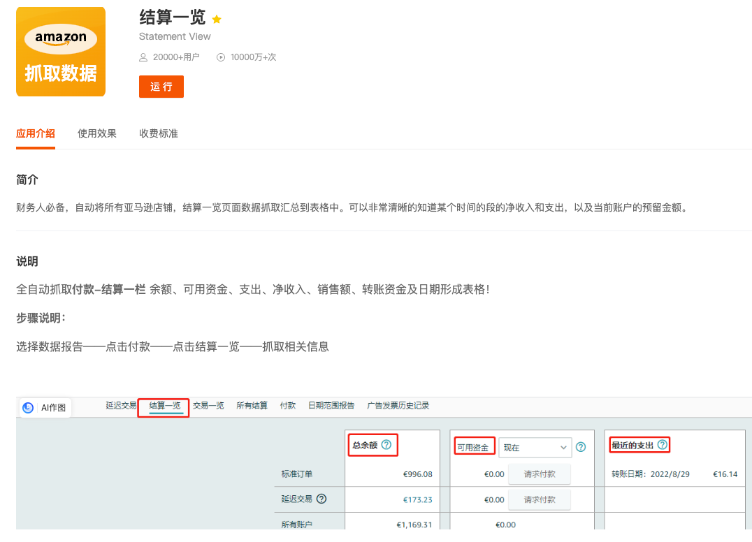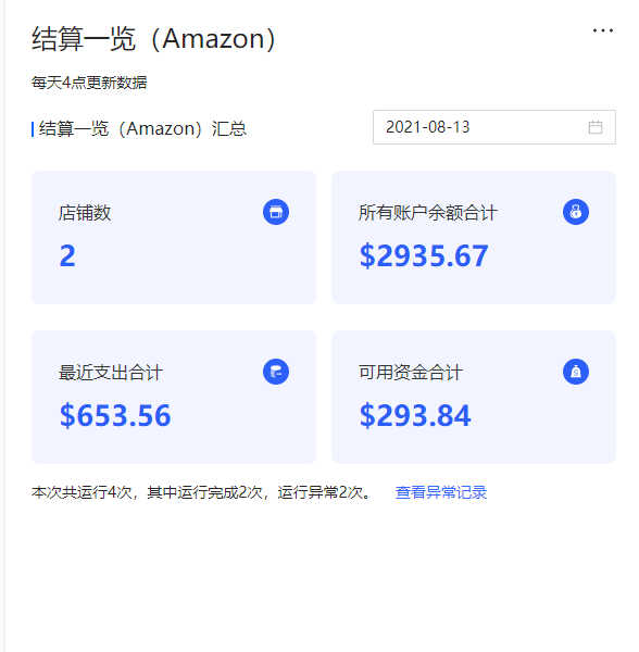 结算一览:全自动抓取付款-结算一栏中余额、可用资金、收支、销售额、转账资金及日期;通过应用看板,假期想看随时一目了然。