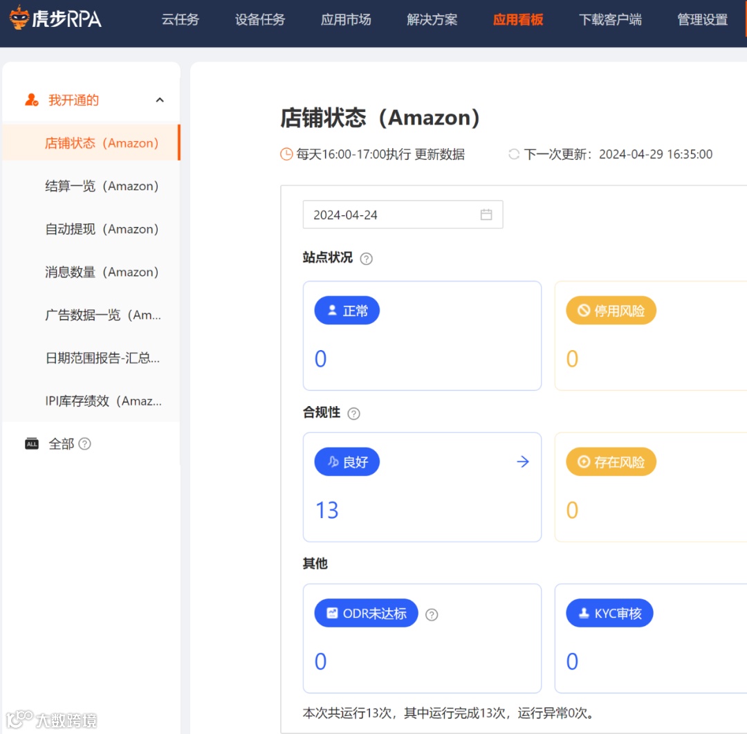 店铺状态绩效汇总详细版:把所有店铺的状态绩效一次性全部拉出来并汇总到一张表。结合虎步RPA的应用看板功能,在度假期间偶尔也能抽空看下店铺有没有问题。