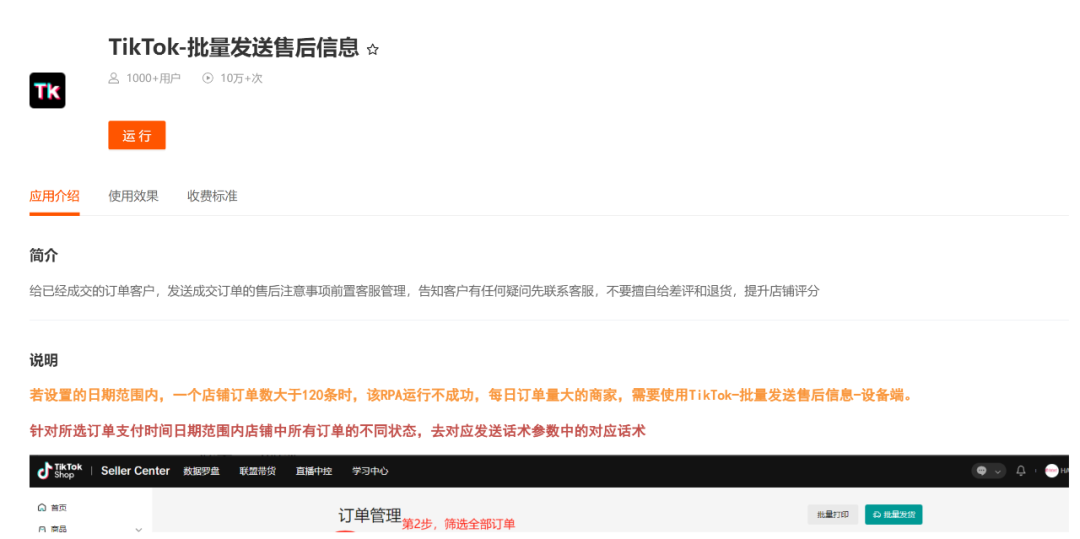 TikTok-批量发送售后信息:根据订单的当前状态(包括待处理、已发货、已送达、已完成、已取消),在每个环节向客户自动发送设置好的买家关怀文案,提升履约过程中的人文关怀,从源头增加好评、减少差评。