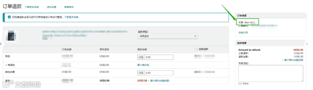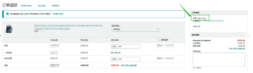 在FBA订单详情页展示的是买家昵称,在订单退款页则体现买家全名