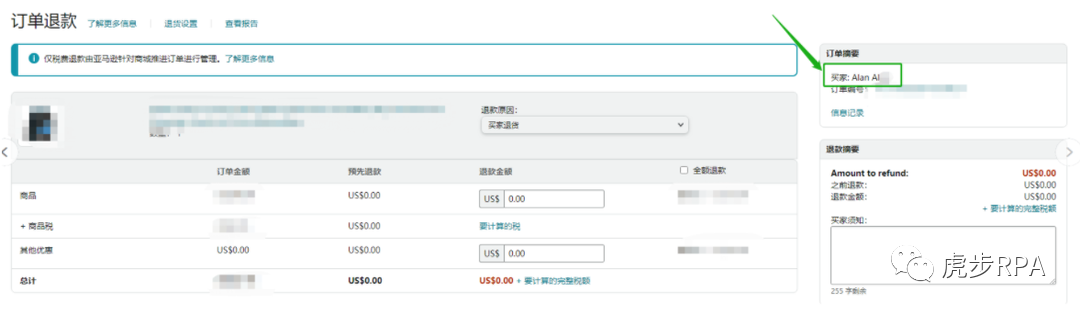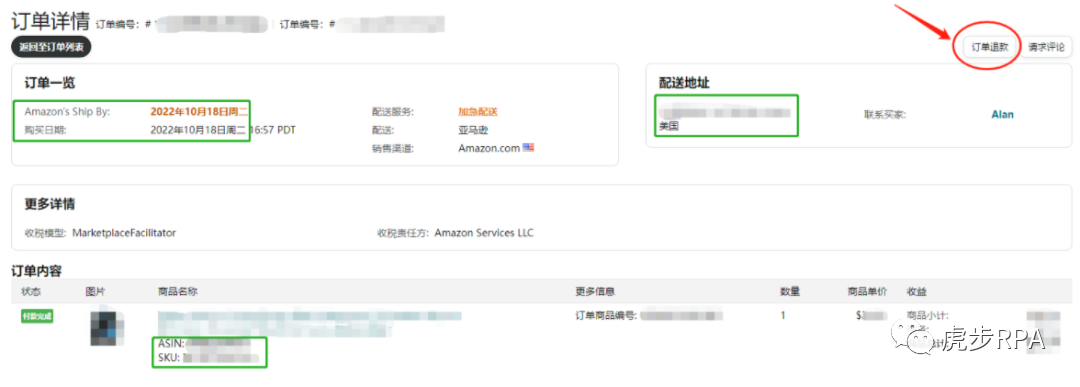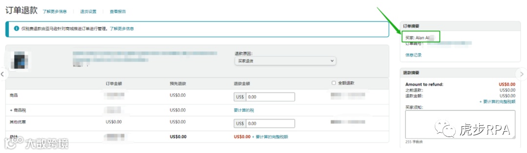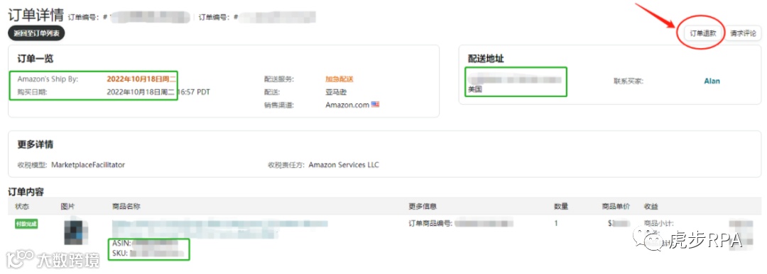 在订单详情的界面中展示的买家姓名是亚马逊系统匹配的买家昵称,想获取买家的全名,还需在订单详情中,点击订单退款界面,从订单摘要中获取买家全名。