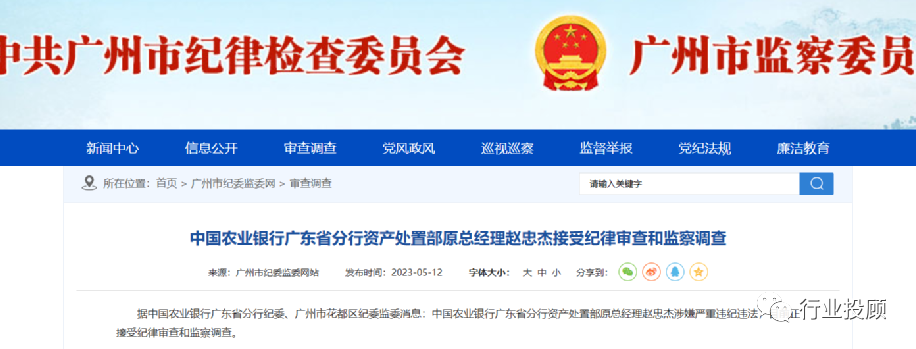 5月12日,广州市纪委监委网站通报,据中国农业银行广东省分行纪委、广州市花都区纪委监委消息:中国农业银行广东省分行资产处置部原总经理赵忠杰涉嫌严重违纪违法,目前正接受纪律审查和监察调查。