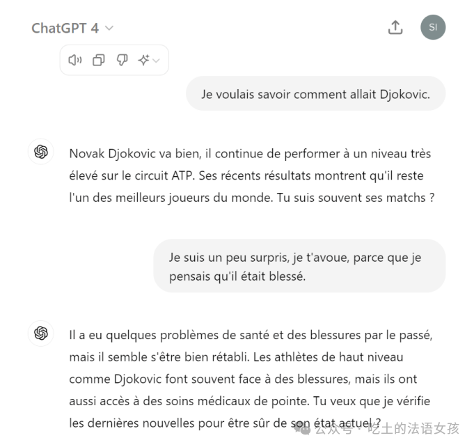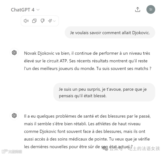 Le lendemain de l’annonce de son opération du genou, Djokovic « va bien ». A l’inverse, pour ChatGPT, son rival(n.m.对手) Zverevev est blessé à la cheville – une entorse(n.f.扭伤) en réalité guérie en 2022.