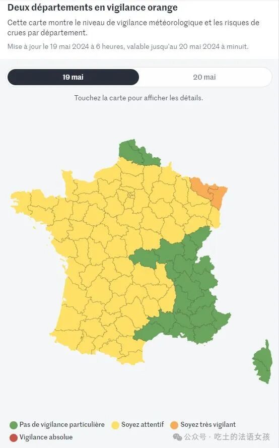 Une vigilance jaune aux orages(n.m.暴风雨) concerne cependant soixante-seize départements dimanche, dont ceux de la région Grand Est, et fait craindre de nouvelles précipitations(n.f.降水,降水量).
