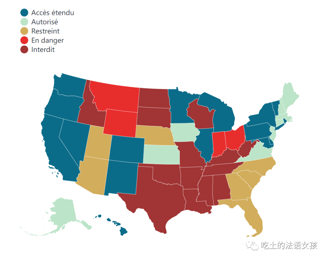 Dans l’Indiana, le Wyoming, l’Ohio et le Montana l’accès à l’IVG n’est pas interdit, mais est menacé (en rouge sur la carte). Des textes visant à l’interdire ou à le restreindre sont contestés(v.t.争议,怀疑) dans les tribunaux(n.m. ~al法院).