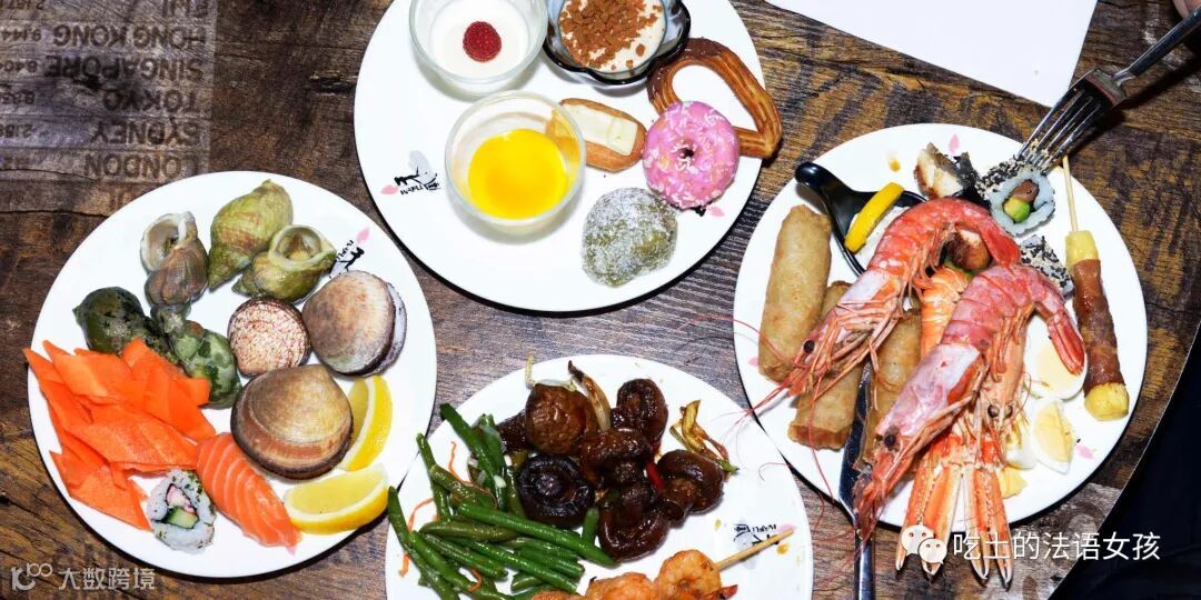 Après vingt minutes d’attente, la famille est invitée à rejoindre une table collée à la vitre maculée de(有..污迹) bisous d’un jardin d’enfants. Pour accéder au banquet(n.m.宴会), situé à une bonne minute de marche, il faut se frayer un chemin(开出一条路) entre les grappes(n.f.群,伙,帮) de mangeurs et les androïdes(n.m.机器人) à tête de chat qui acheminent les breuvages(n.m.饮料). Arrivés à destination, père et fils marquent un temps d’arrêt(..了一瞬). Par où commencer ? Le tableau général évoque un grand bazar(n.m.集市) de quelque trois cents mets… A droite du jambon à la découpe trône(v.i.端坐居中) l’incontournable fontaine à chocolat. En face des ragoûts, des bonbonnières de toutes les couleurs. A côté des sushis(n.m.寿司), des fromages rivalisent avec des poissons frits et des kilos de viande crue attendent de passer sur le gril(n.m.烤架).