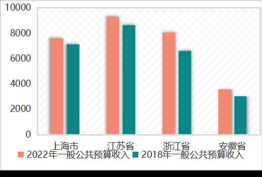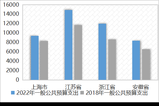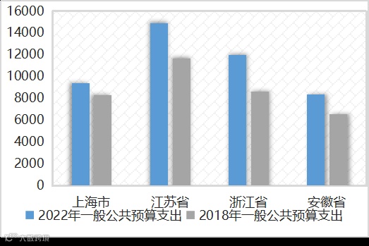 从地区财政收支看,2022年全年长三角地区地方一般公共预算收入2.85万亿元,较2018年增长12.25%;同期,地区地方一般公共预算支出4.47万亿元,较2018年增长26.93%,支出有力保障了国家和区域内重大战略决策部署和战略任务的实施,同时也较好改善了长三角区域内城市间交通、生态环境、社会民生等领域的公共产品供给水平。