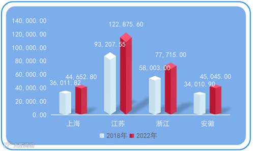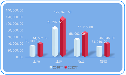 图1 2018年、2022年沪苏浙皖地区生产总值(单位:亿元)