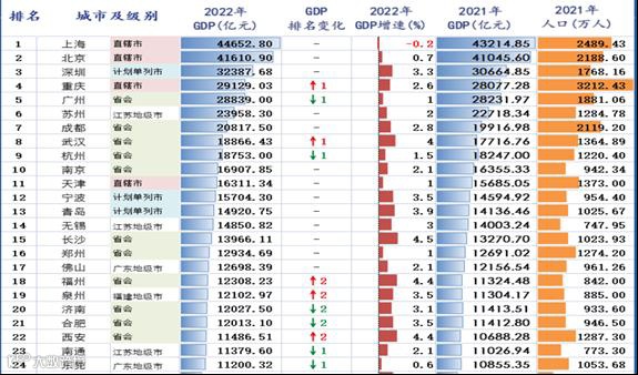 图2 2022年地区生产总值万亿以上城市情况(含直辖市)