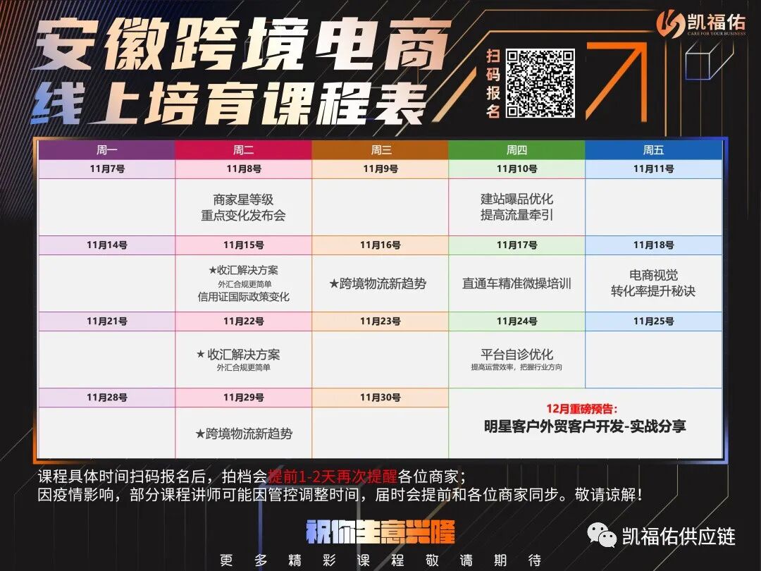 近期安徽疫情影响严重,为了更有质量的服务商家,凯福佑在11月份推出定制化的培训课程,希望能给大安徽商家的平台带来帮助。