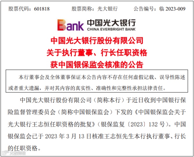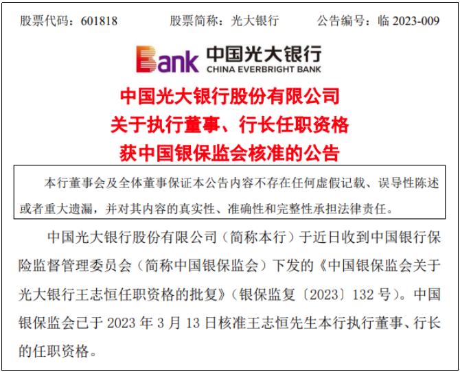 3月15日,光大银行发布的公告显示,王志恒任该行行长的任职资格已经获批。