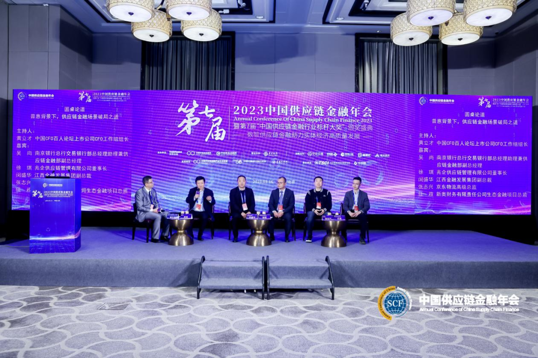 下午第二场圆桌论坛由中国CFO百人论坛上市公司CFO工作组组长黄立才主持,论题为“普惠背景下,供应链金融场景破局之道”。南京银行总行交易银行部总经理助理兼供应链金融部副总经理吴尚;兆企供应链管理有限公司董事长徐琪;江西金融发展集团副总裁闵盛华;京东物流高级总监张志兴;新奥财务有限责任公司生态金融项目总监任政参与了此次讨论。