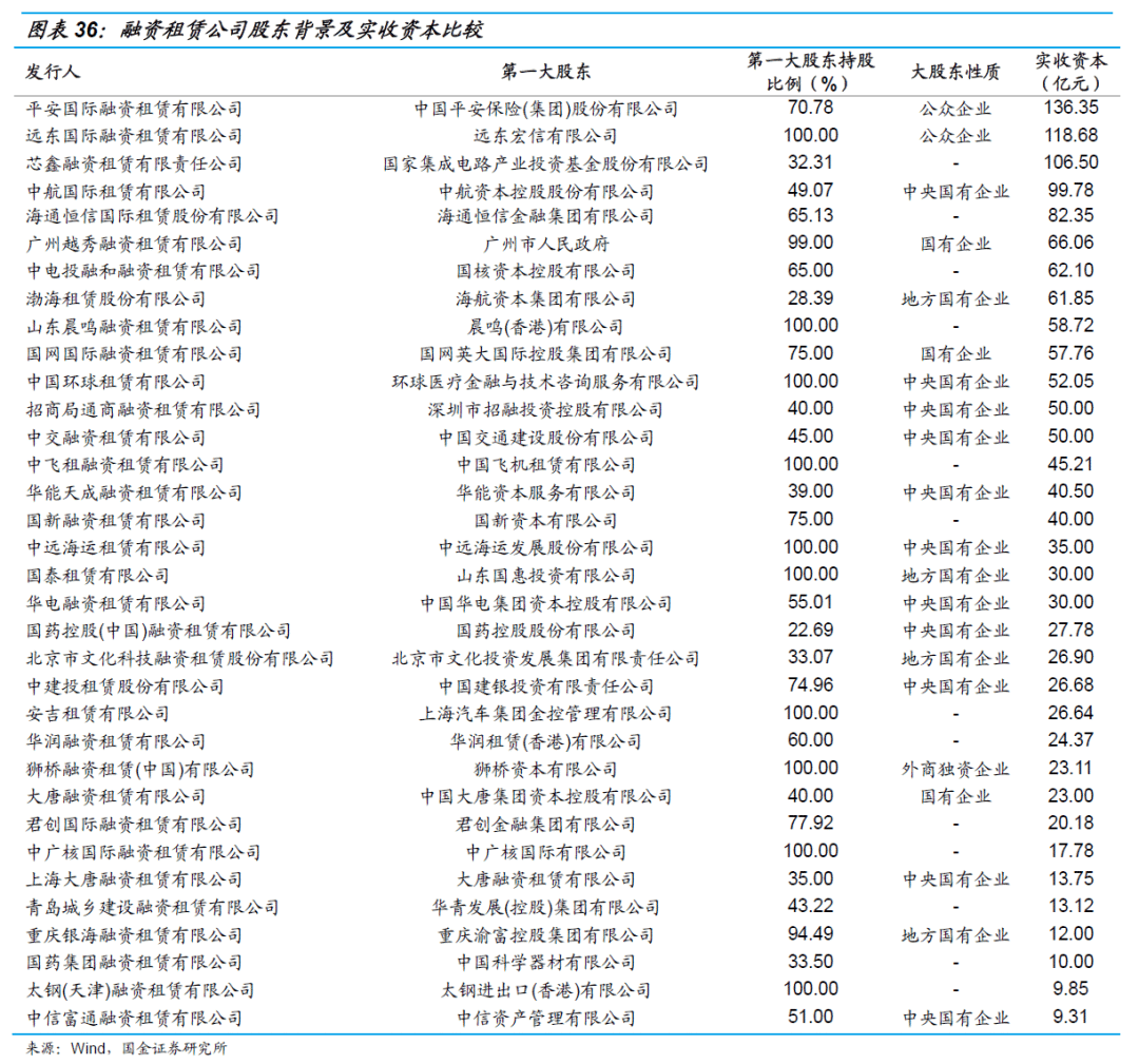 在34家融资租赁公司中,实收资本规模最大的是平安租赁,为136.35亿元,其第一大股东为平安保险集团,属于第三方系租赁公司,依托平安保险集团的资源优势和专业实力,平安租赁业务多元化,涉及城市发展、企业融资、汽车金融等多个板块。远东租赁以实收资本118.68亿元位居第二,系远东宏信有限公司的全资子公司,属于第三方系租赁公司,公司业务分为金融及咨询分部和产业运营分部,涉及业务广泛,公司规模和盈利水平等均排在行业前列。芯鑫租赁依托大股东国家集成电路产业投资基金股份有限公司,获得股东在项目营销、专业技术、业务协同等方面的支持,在集成电路及半导体行业具有较高的专业水平,实收资本106.50亿元,在融资租赁公司中位居第三。越秀租赁背靠广州市人民政府,是典型的平台系租赁公司,实收资本66.06亿元,位列第六,业务主要涉及民生工程行业、基建设备租赁项目等,在广东省内具有较强的竞争力。山东晨鸣租赁股东晨鸣纸业集团计划聚焦造纸业主业,剥离非核心业务,包括融资租赁业务,未来山东晨鸣租赁受到的股东支持力度或将削弱。